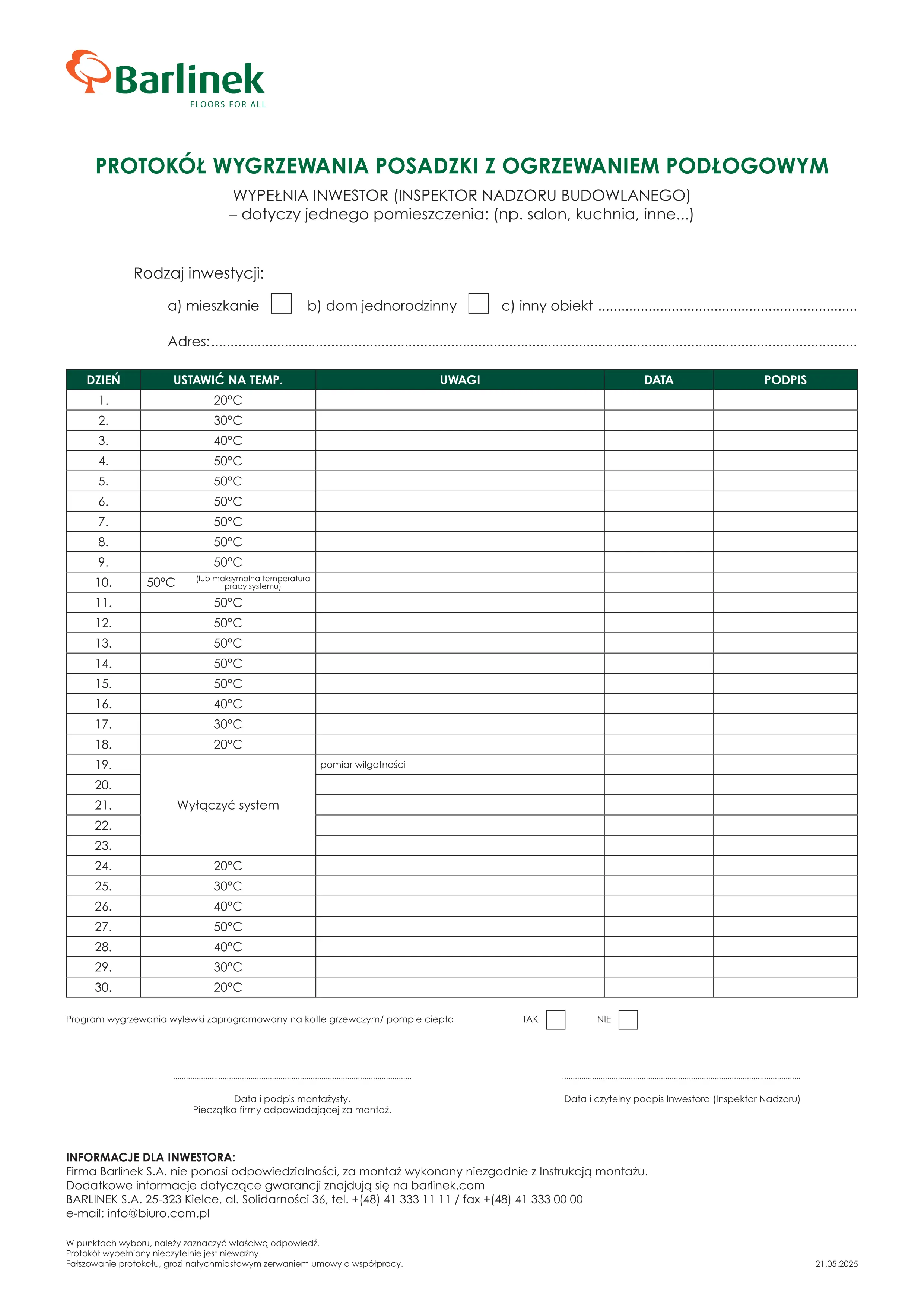 Końcowy cykl wygrzewania powtarza krótszy wzorzec: od 20°C w pierwszym dniu, przez 30°C w drugim, 40°C w trzecim, do ponownego osiągnięcia 50°C w czwartym dniu, po czym temperatura maleje do 20°C w dniu ostatnim cyklu. Moment, w którym wylewka osiąga stabilną wilgotność poniżej 2 procent, wyznacza koniec procedury i bezpieczny start montażu paneli podłogowych. Dokumentowanie każdego dnia wygrzewania oraz podpisy montażysty i inwestora w protokole jest konieczne dla zachowania gwarancji producenta zarówno jastrychu, jak i samych paneli podłogowych.